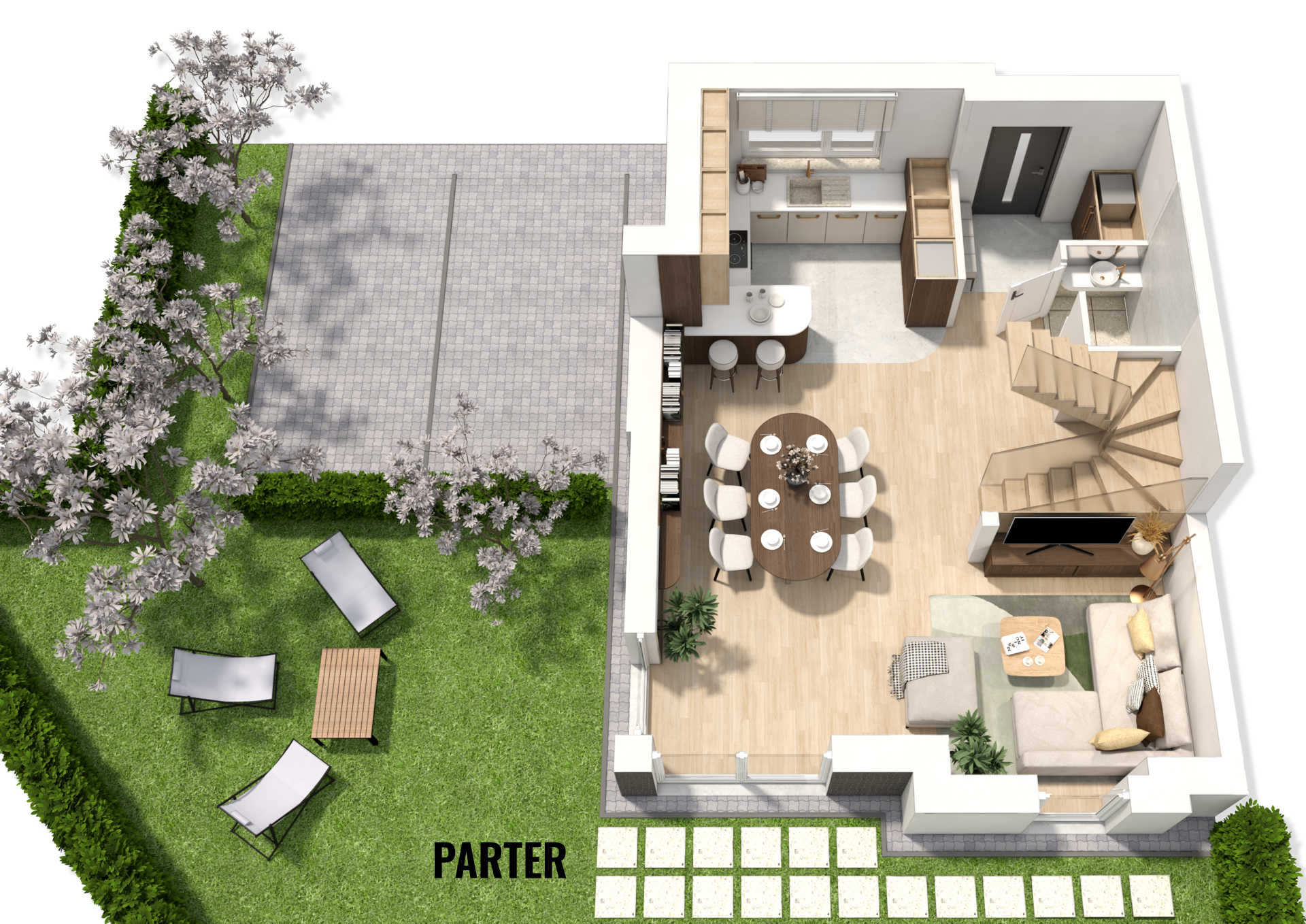 Klientka przygotowywała do sprzedaży dom dwukondygnacyjny z antresolą. Aby ułatwić prezentację oferty, opracowałam wizualizacje wnętrz, rzuty 3D z aranżacją oraz rzuty 2D z trzema wariantami zabudowy antresoli. Całość pokazuje potencjał przestrzeni, funkcjonalny układ mebli i możliwość wydzielenia dodatkowej sypialni.