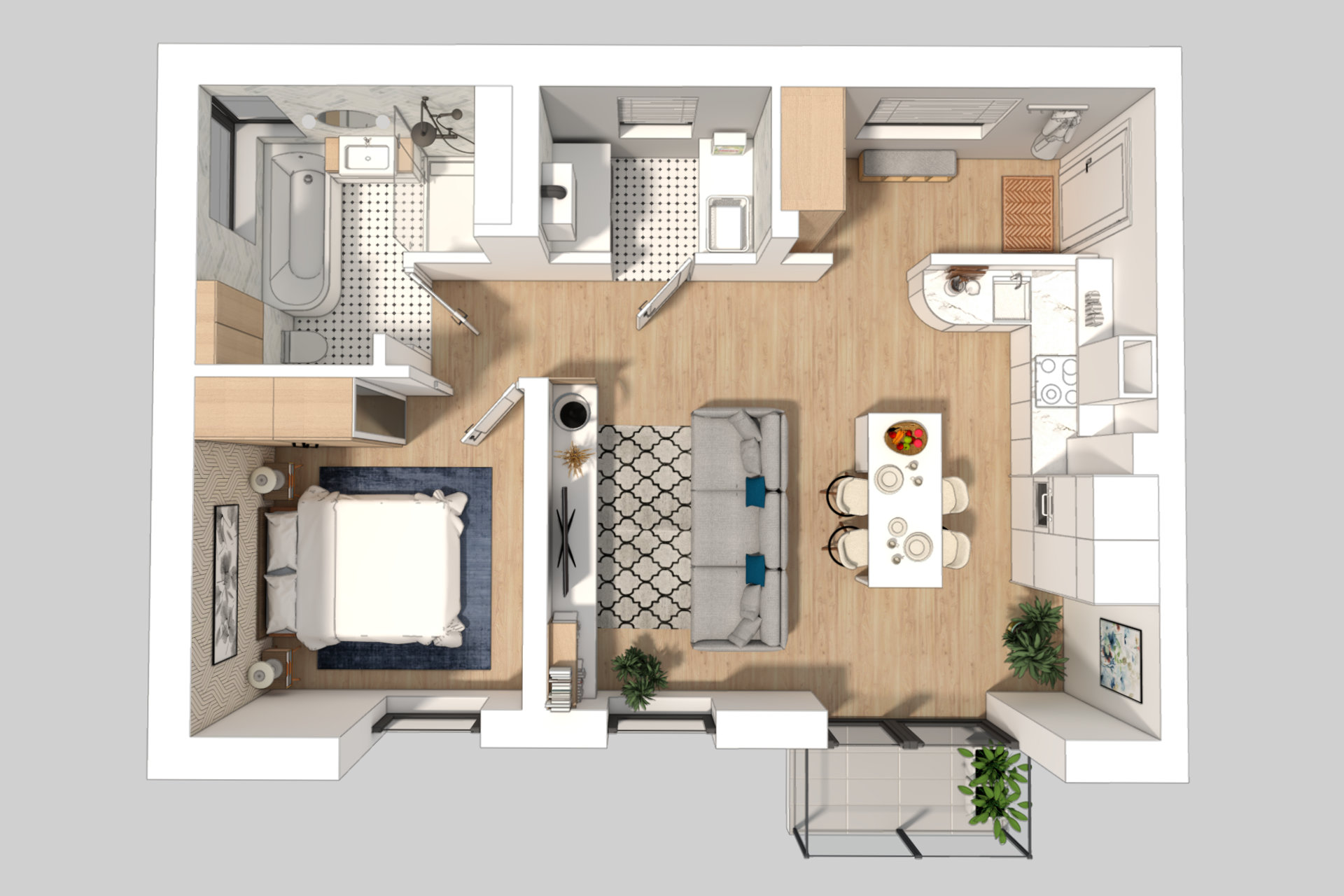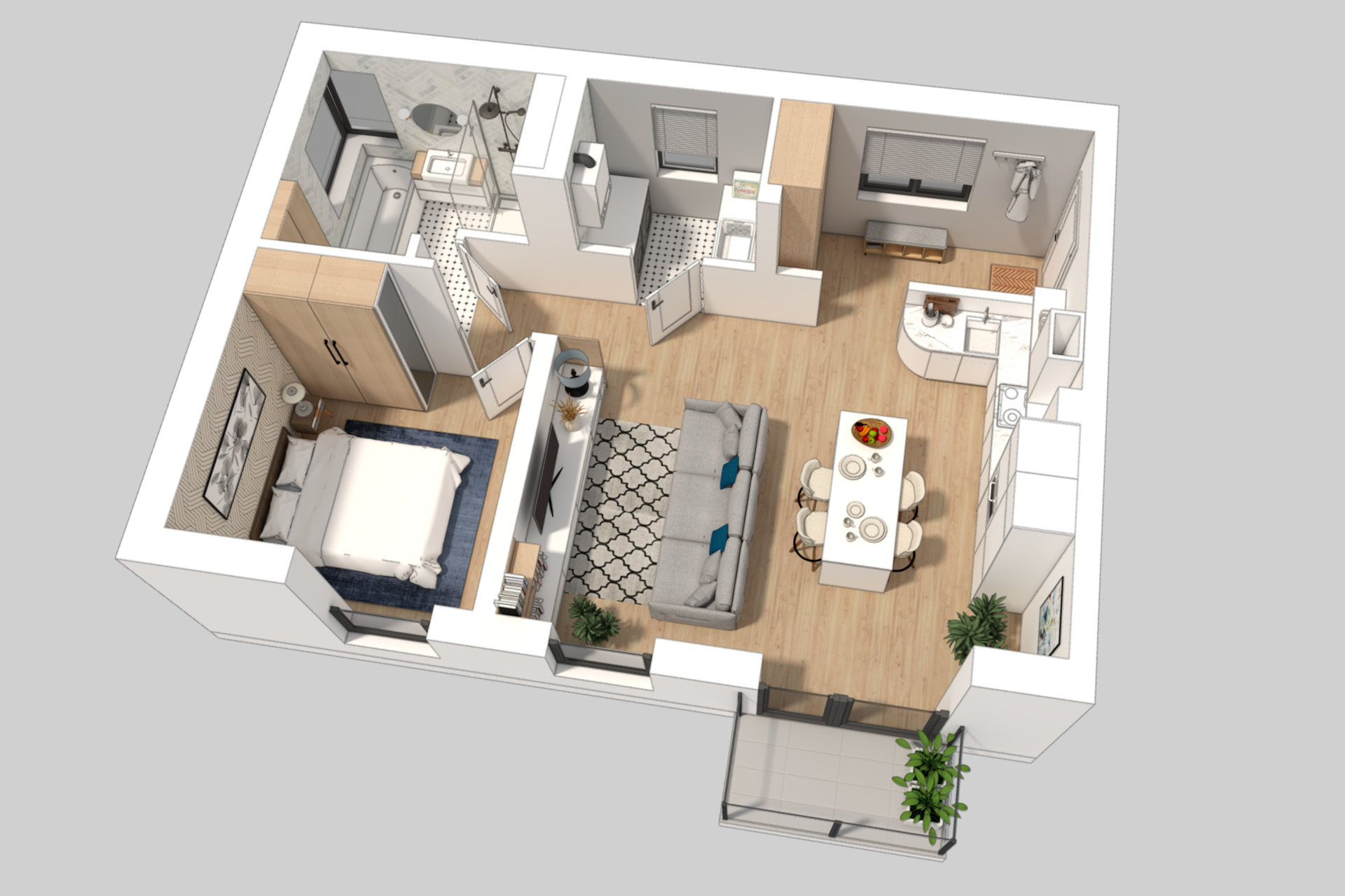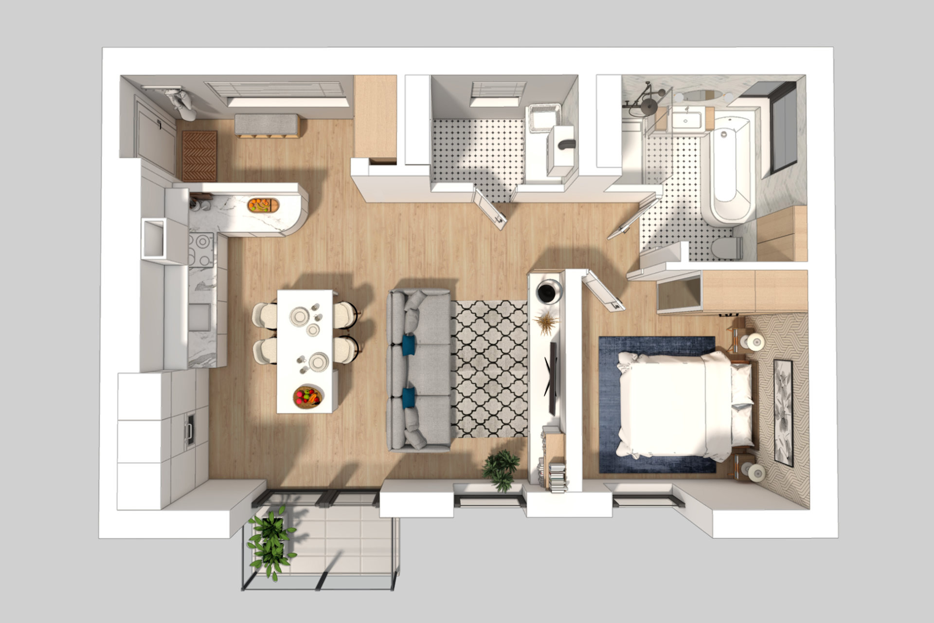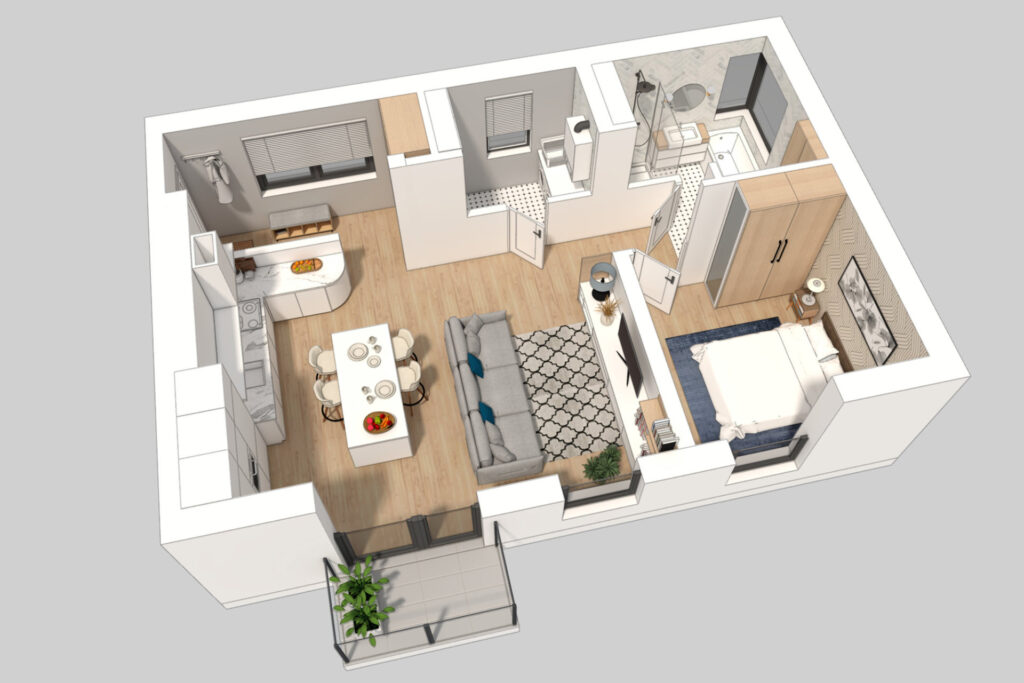 Zlecenie polegało na wymodelowaniu 2 mieszkań o podobnej powierzchni. Rzuty lokali zaprojektowano w odbiciu lustrzanym. Dodatkowo, na życzenie Inwestora zaprezentowałam dwa różne układy funkcjonalne każdego z mieszkań. W jednej z wersji – lokal miał duży salon z jadalnią, natomiast w drugiej wersji – dodatkowy pokój.