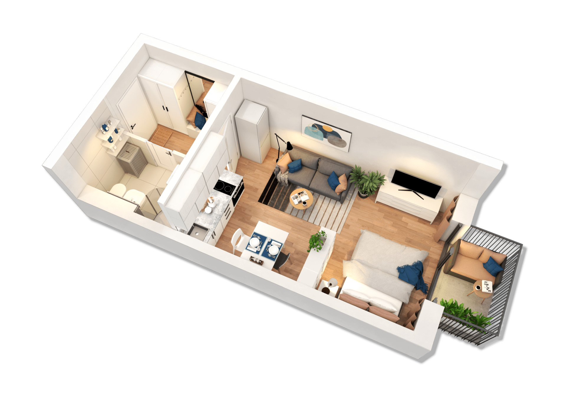 Inwestycja Klienta to budynek wielorodzinny z mieszkaniami o dwóch powtarzalnych układach. Planując umieszczenie wizualizacji mieszkań wzorcowych na stronie sprzedażowej, Klient zlecił mi ich wykonanie. Przygotowałam rzuty 3D, odwzorowując układ i wyposażenie lokali. W wizualizacjach zastosowałam subtelny home staging, dopasowany do kolorów marki Klienta. Dzięki temu grafiki są spójne ze stroną sprzedażową. Rzuty 3D pomagają zainteresowanym lepiej zrozumieć układ mieszkań i standard ich wykończenia.